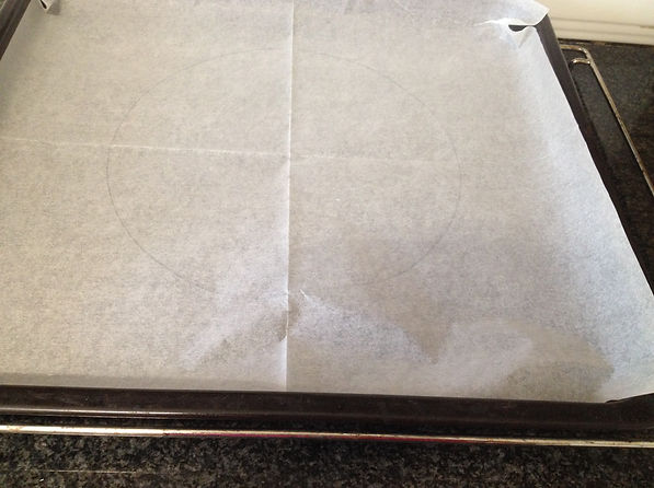 מחממים תנור ל-165 מעלות. לוקחים בסיס של תבנית עגולה בקוטר 24 ס"מ ומשרטטים על גבי שלושה ניירות אפייה עיגולים בעזרת עיפרון (עיגול בכל נייר). מניחים את ניירות האפייה הפוך על תבניות תנור .